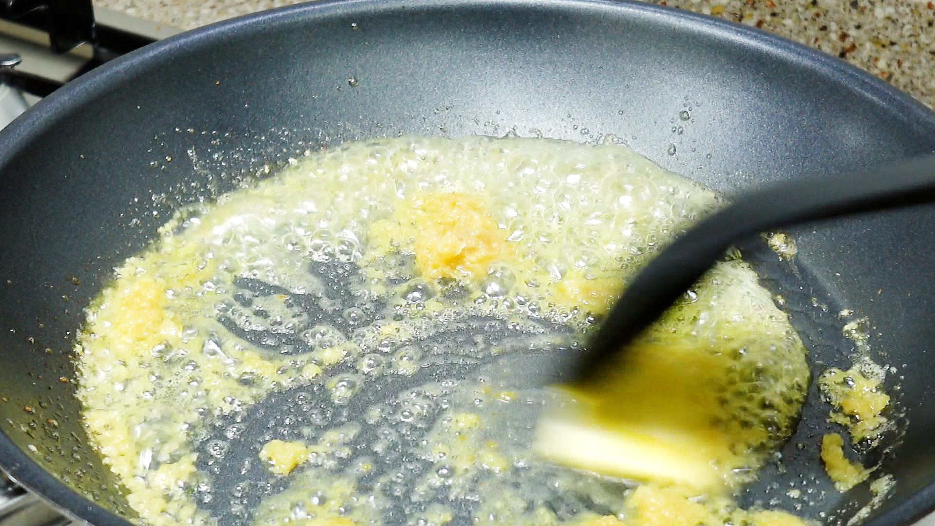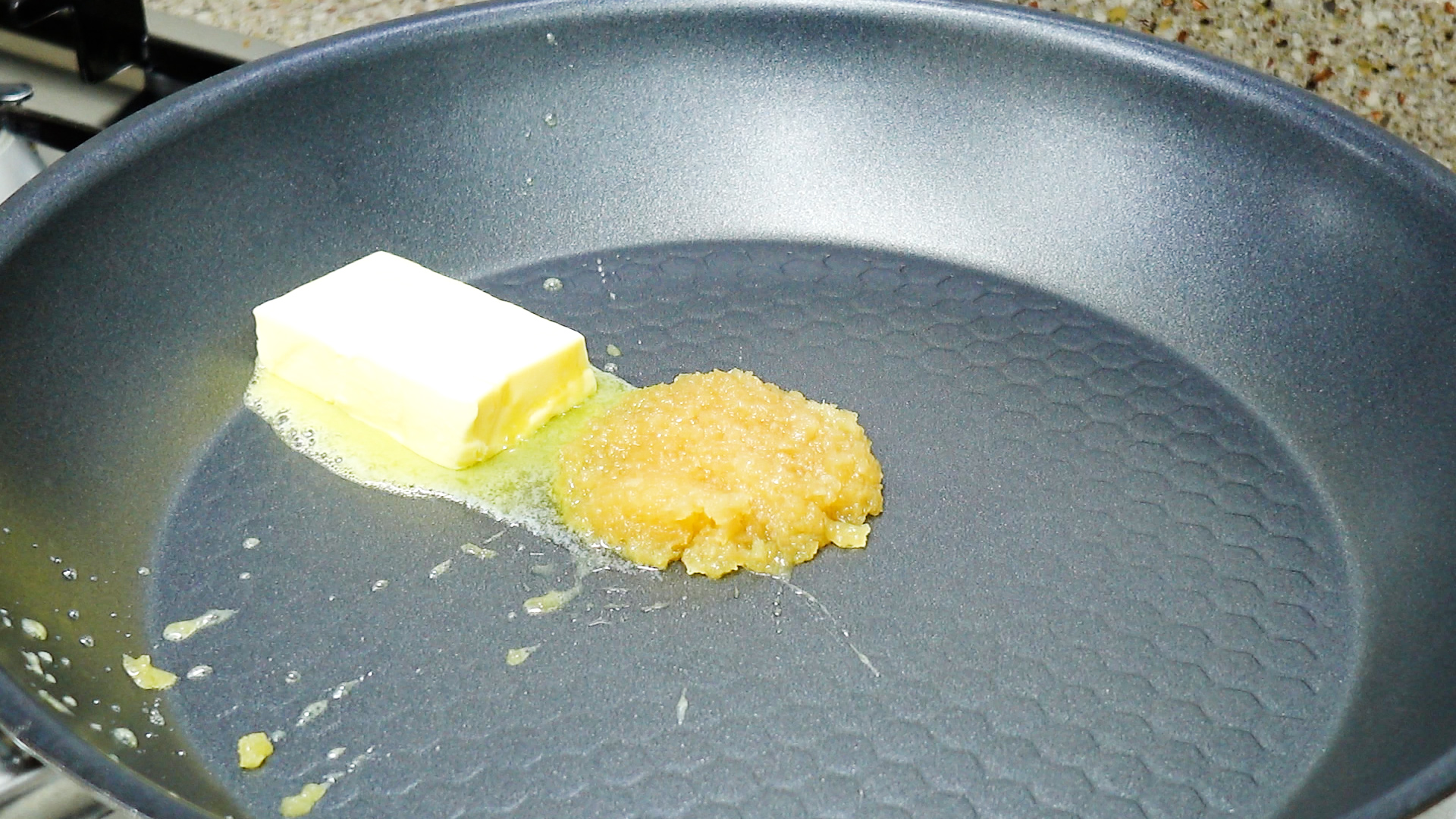 팬에 불을 켜지 않은 상태에서 버터 40g과 다진 마늘 0.5T를 넣은 후, 중약불에서 볶아주세요. 마늘은 갈색으로 충분히 변해야 감칠맛이 제대로 나더라고요.