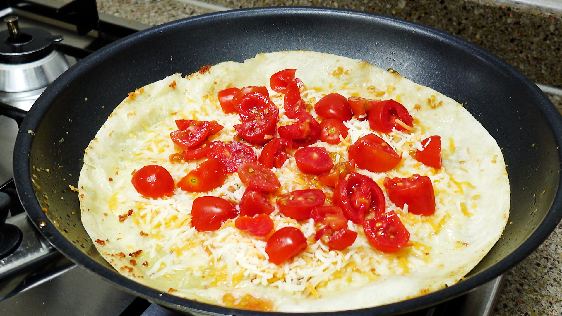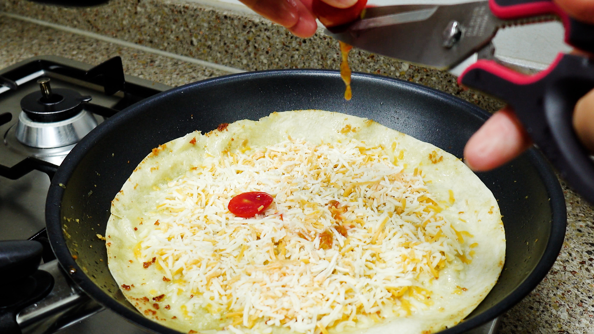 구운 또띠아 위에 치즈를 듬뿍 올려주세요. 가장자리를 2cm 정도 남겨 치즈가 밖으로 흘러내리지 않게 조심해 주세요!