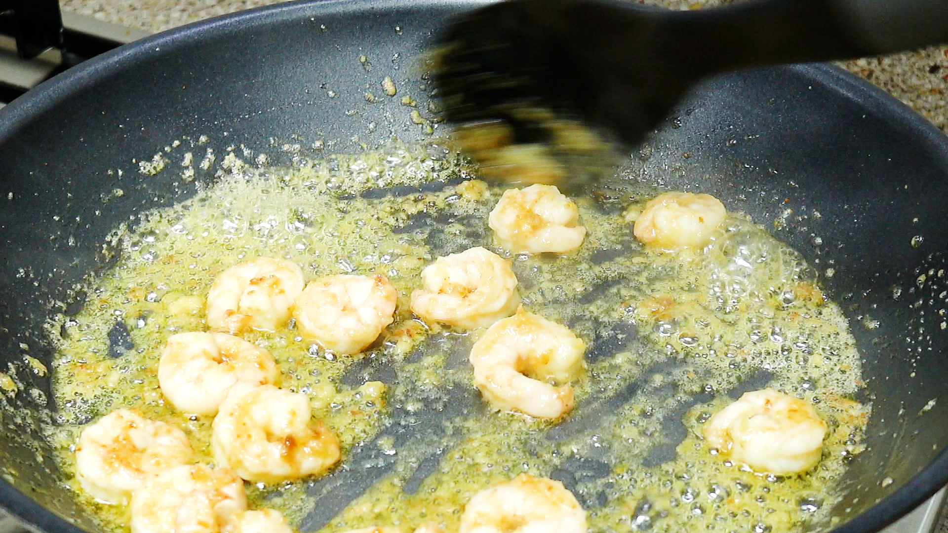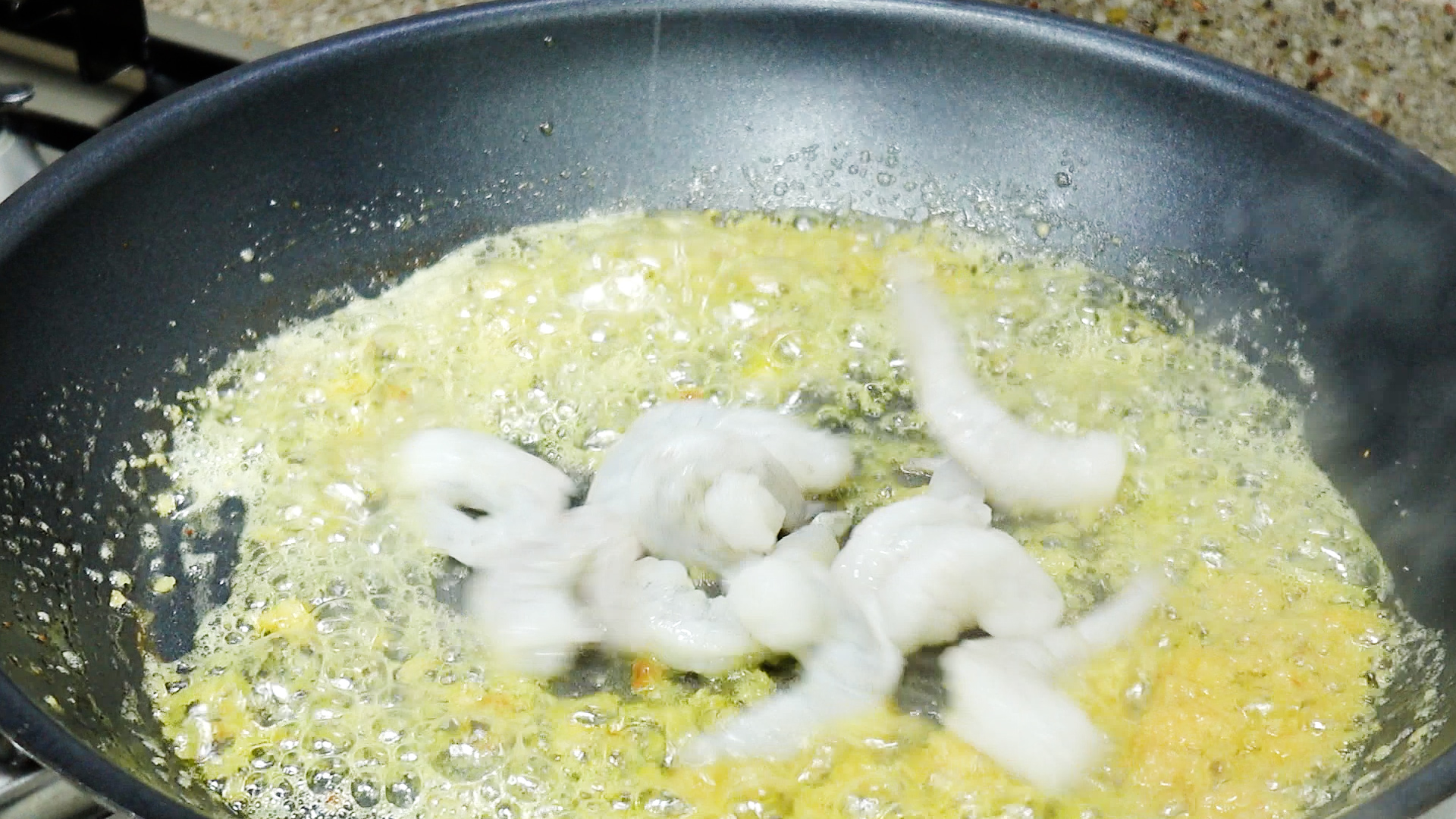 마늘이 갈색으로 변하기 시작하면 약불로 줄이고 새우를 넣어 5분간 천천히 익혀줍니다. 새우가 익으면 새우를 꺼내 주시고, 이때 나오는 마늘기름도 따로 담아둡니다. 나중에 피자에 사용될 포인트예요!!