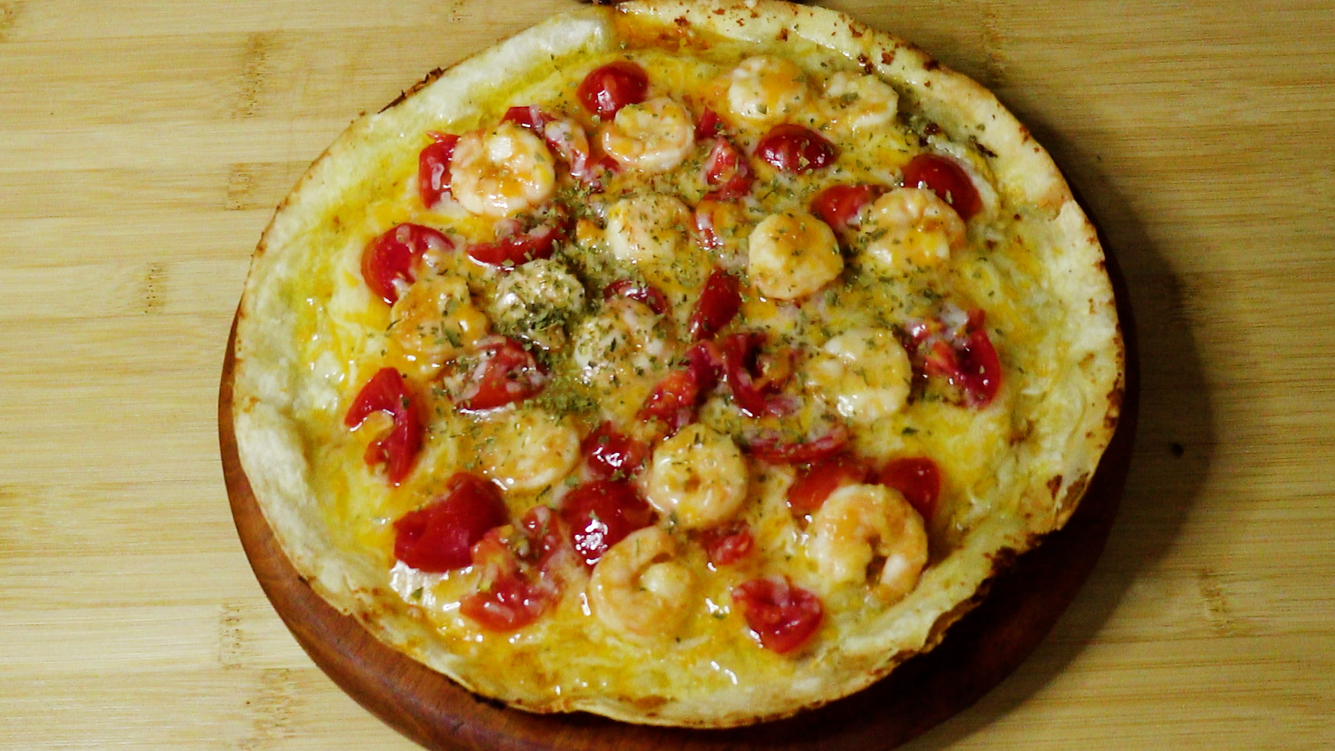 이어서 준비해 둔 새우를 올리고, 함께 담아둔 마늘기름도 피자 위에 골고루 뿌려주세요.